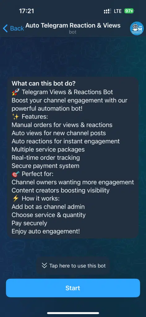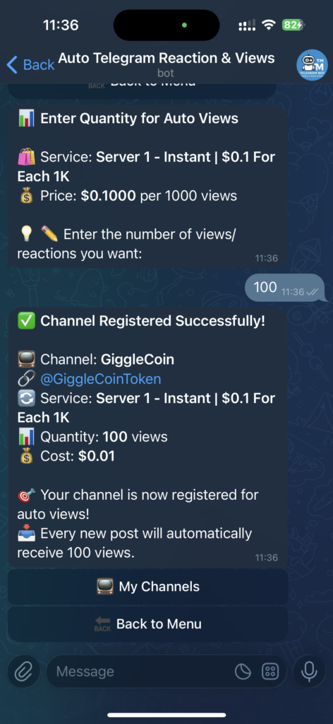 This bot enables you to add your channel with the exact settings you need, and based on your preferences, every new post you publish will automatically receive views or reactions according to your selected configuration—completely hands-free.
