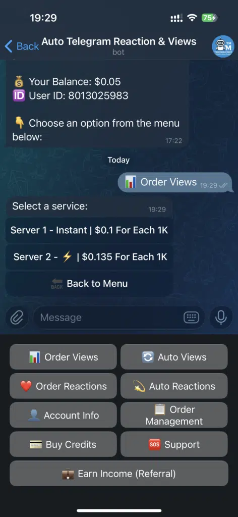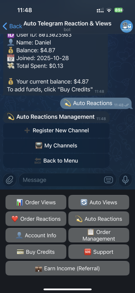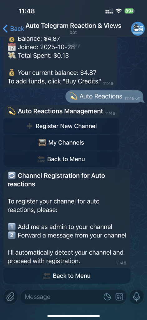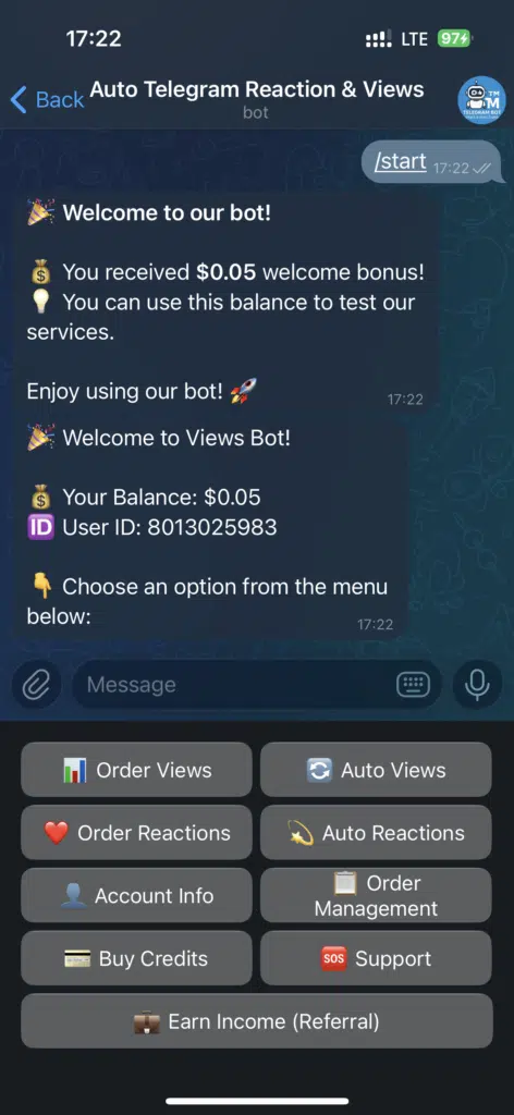 As shown in the images below, you’ll receive $0.05 of free initial credit, which you can use to test the bot — either manually or automatically — for adding reactions and views to your Telegram channel posts.