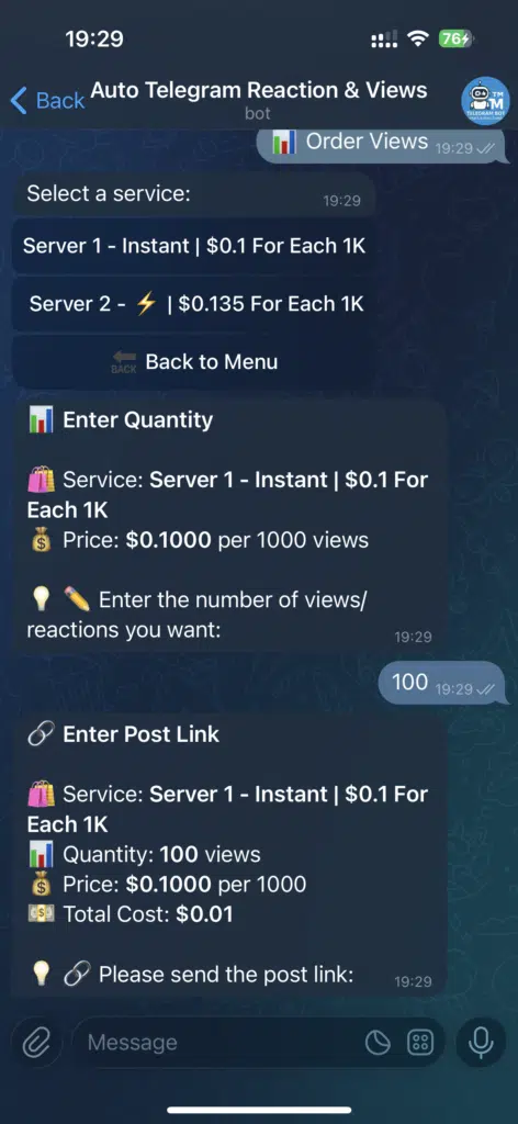 Next, send the link of the post you want to order reactions for to the bot. The link should follow this format:https://t.me/USERNAME/POSTNUMBER