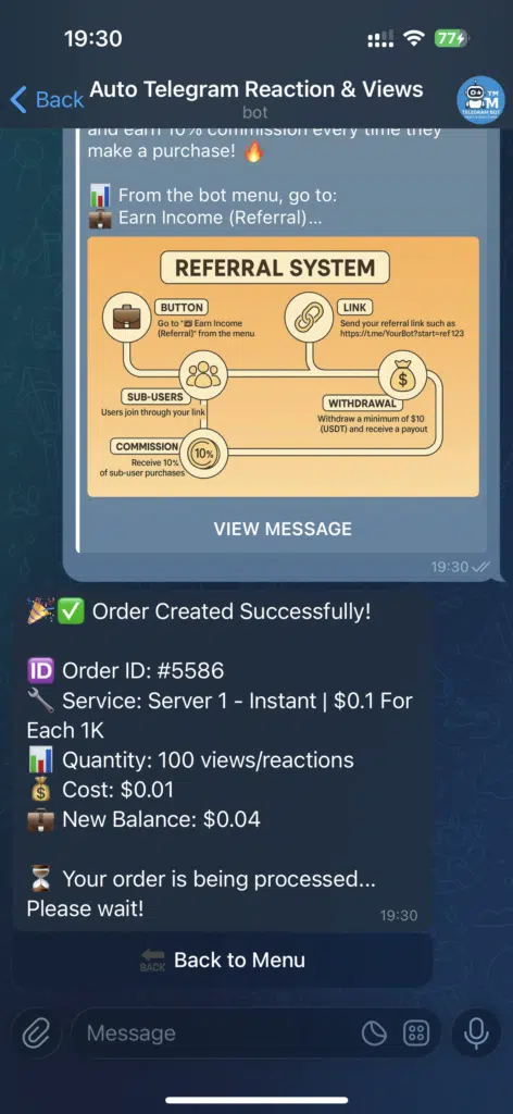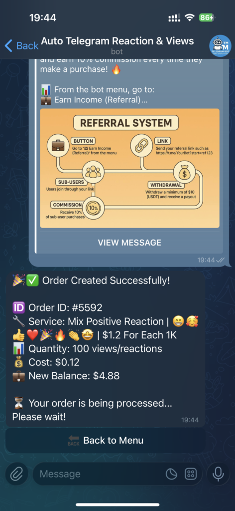 After that, the bot will confirm that your order has been successfully placed and display additional details such as the order cost and more.