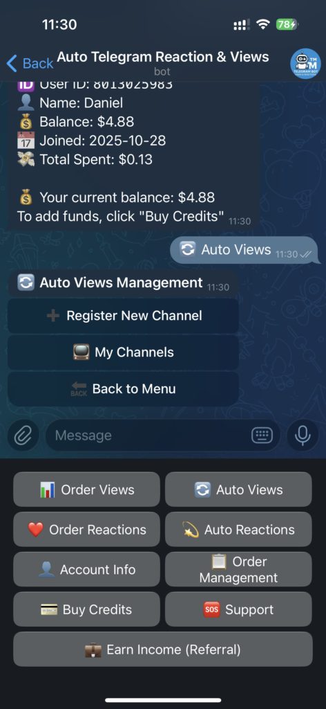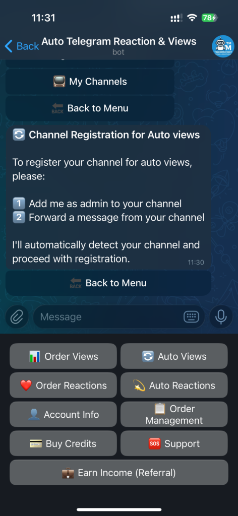 - 🔄 Auto Views – to add your channels and automatically deliver views to any new posts you publish.