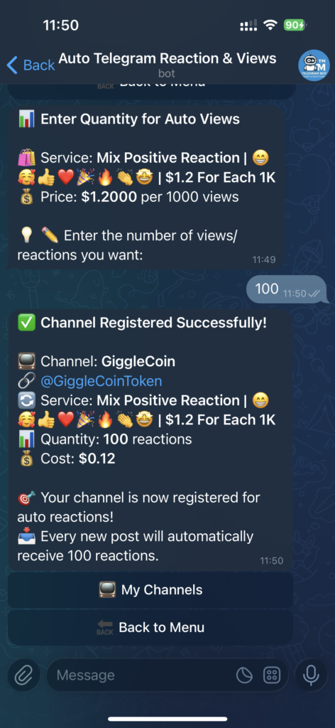 After successful registration, you’ll receive a confirmation message showing your saved details — including the channel information, selected service, reaction quantity, and cost per post.